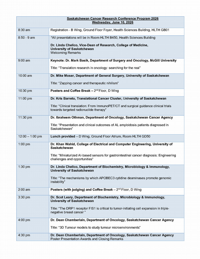 It will include the Keynote Speaker presentation, presentations from a variety of Saskatchewan cancer researchers, a morning and afternoon poster session where the trainees can present their research, and plenty of networking opportunities both at lunch and at the poster sessions.